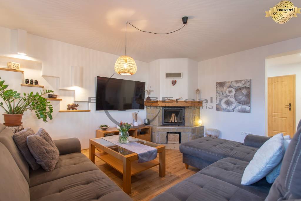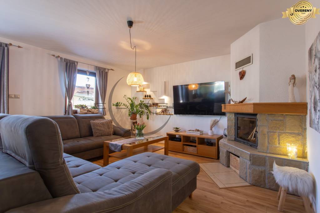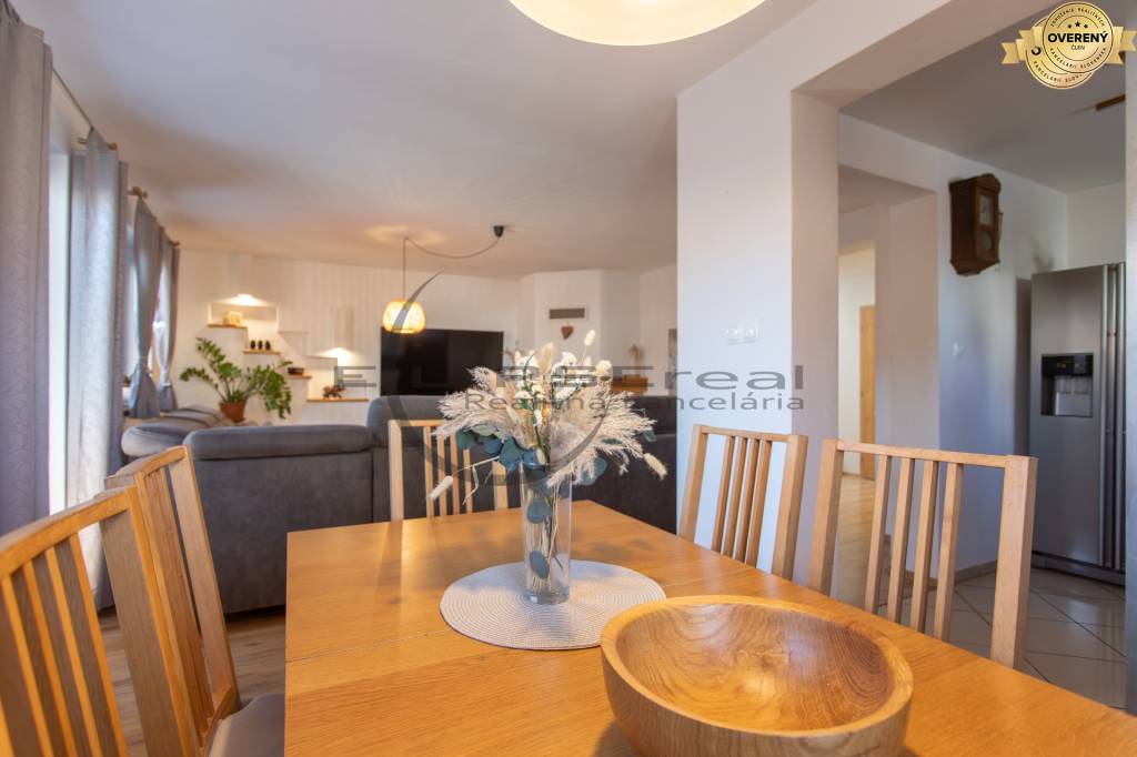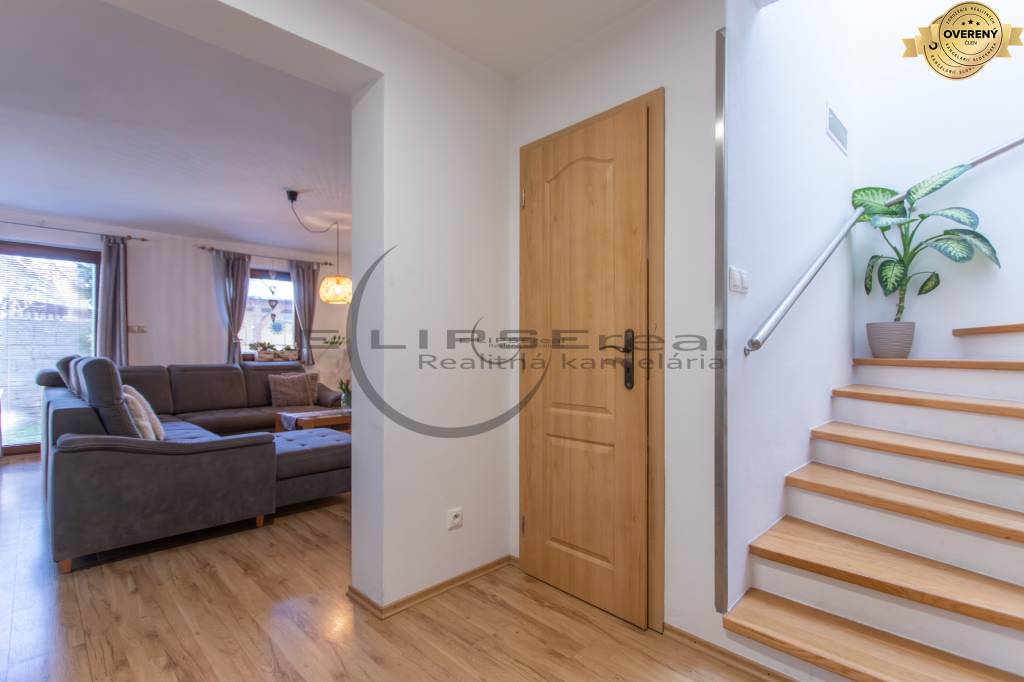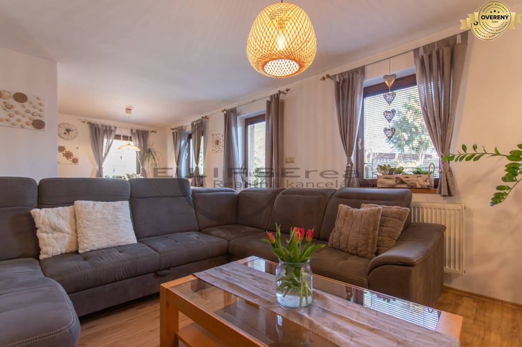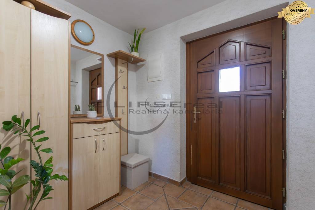 Dom zaujme svojou architektúrou a zariadením, ktoré prepája tradičné prvky so súčasnými modernými požiadavkami bývania. Denná časť domu s priamym vstupom do záhrady je situovaná na prízemí a tvorí ju vstupná predsieň prepojená chodbou, z ktorej sa vchádza do technickej miestnosti s práčovňou, samostatnej toalety, na poschodie a do obývačky s krbom, ktorá je voľne prepojená s kuchyňou a jedálňou. Na poschodí sa nachádzajú tri samostatné spálne, z ktorých je jedna vybavená šatníkom a dve spálne majú vstup na spoločný balkón. Situovaný je tu aj výlez na povalu, ktorá je celá pochôdzna a poskytuje pekný úložný a odkladací priestor. Ďalej sa tu nachádza centrálna kúpeľňa s hydromasážnou vaňou, sprchou, toaletou a umývadlom. Celé poschodie je klimatizované.