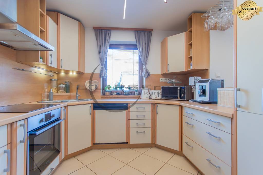 - kuchynská linka na mieru so vstavanými spotrebičmi: indukčná varná doska, elektrická rúra, digestor, umývačka, mikrovlnka, chladnička s mrazničkou